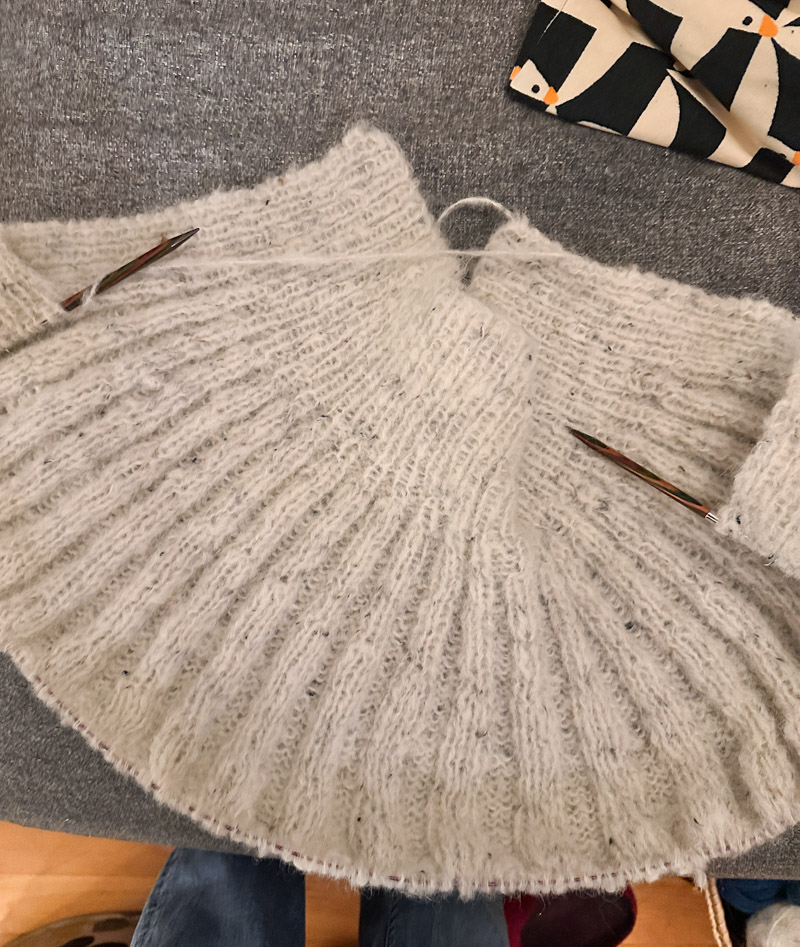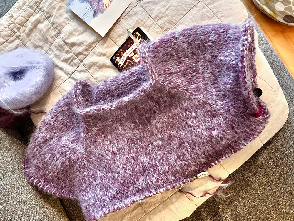 Noa Sweater: Sandnes Garn – zweifädig – einmal ein kuscheliges Alpakka Garn plus einem ziemlich fetzigen Mohair. Mit 5er Nadeln ging es natürlich richtig flott.