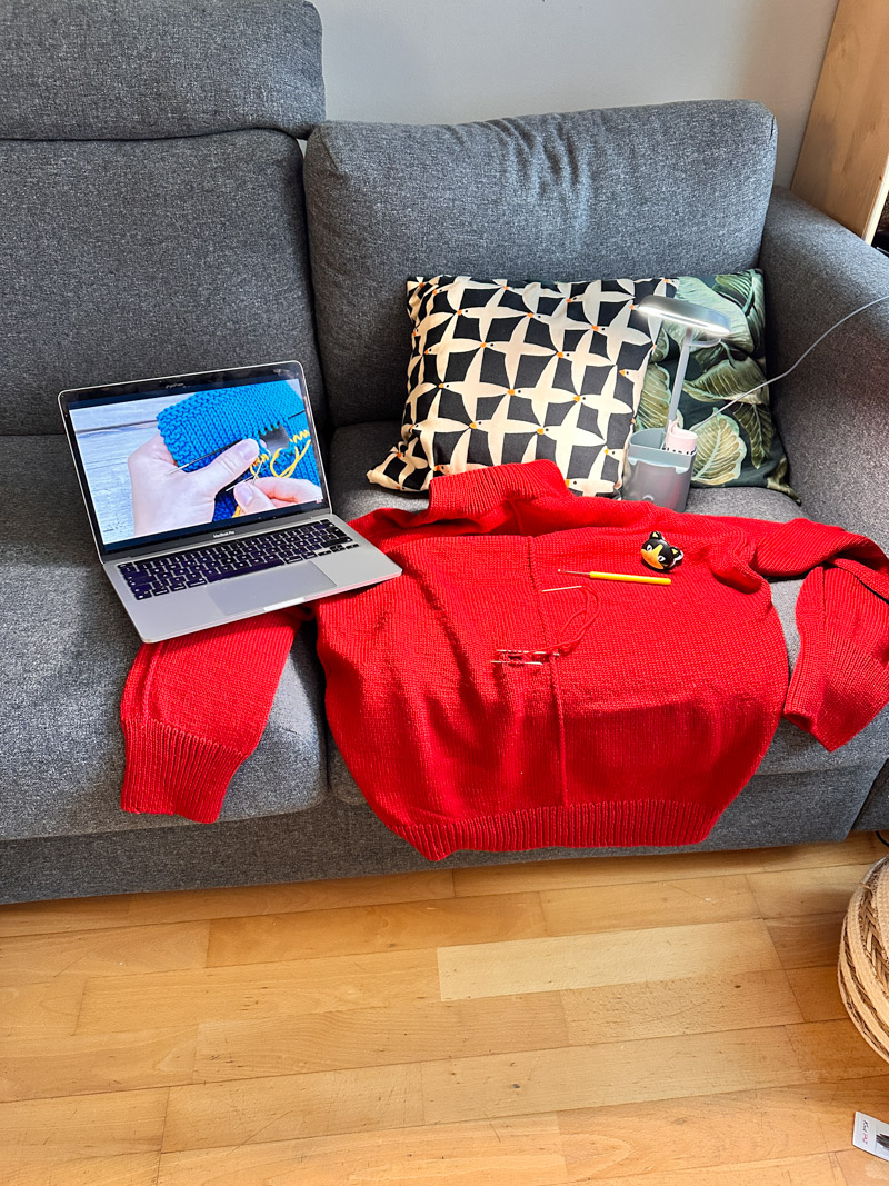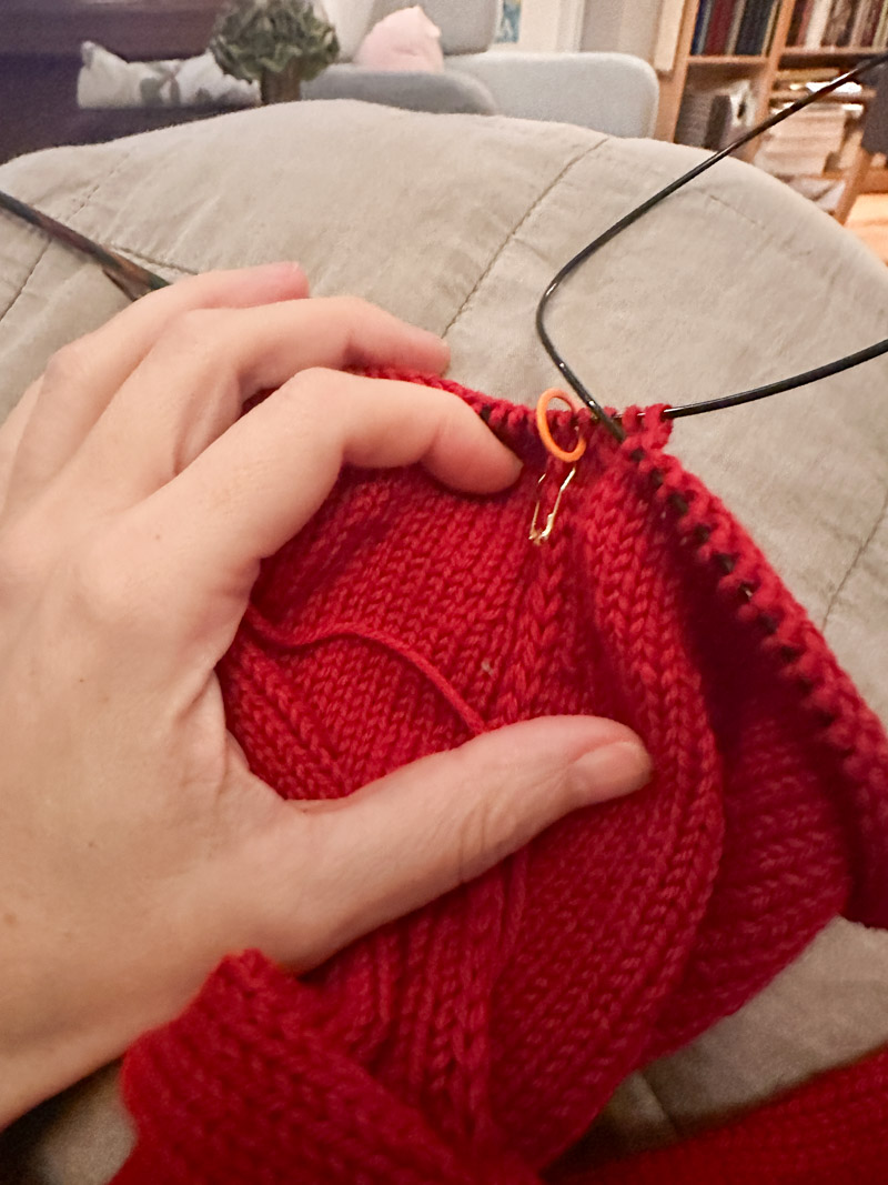 Und weil ich der Meinung bin, dass das rot nicht viel Muster oder irgendeinen speziellen Schnitt braucht um zu wirken, habe ich kurzerhand den Scarlett-Sweater gestrickt. Die Maschenprobe passt und ich mit Anleitungen von petiteknit fahre ich immer gut. Ergo: los gings.
