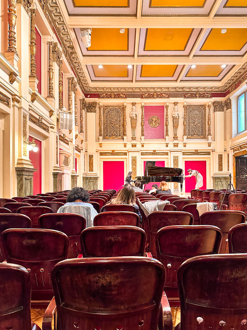 Zu unserer persönlichen Begeisterung hat eine örtliche Klavierlehrerin ihre Schüler:innen auf dem Konzertflügel auf der Bühne ein bißchen üben lassen. Und weil das eine ambitionierte Klavierlehrerin war und ihre Schüler recht ehrgeizige Mütter haben, könnt ihr euch vorstellen, wie das „Üben“ geklungen hat. Ja genau. Wir haben dann einem kleinen Konzert beigewohnt. Lässiges SonntagNachmittagsBequemlichkeitsKonzert. Ich liebe meine Stadt.
